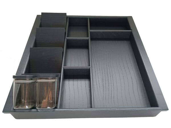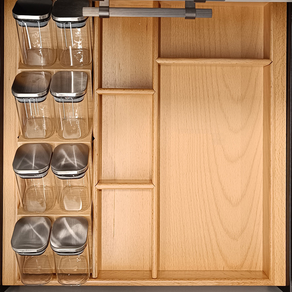 Baharat platformu çekmece içinde ya da tezgah üstünde kaşıklıktan bağımsız şekilde de kullanılabilir. Kavanozların içinin kolaylıkla görülmesini sağlayan özel açılı yapısı sayesinde, hem fonksiyonel hem estetik bir çözüm sunar.