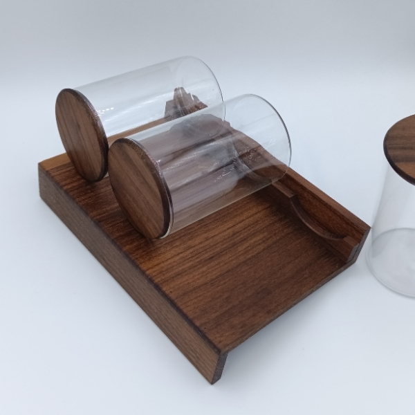 Ceviz ağacının güçlü desenleri ve kaliteli görüntüsü keyfinizi, kullandığınız baharatlar yemeklerinizin lezzetini arttıracaktır. Cam baharat kavanozları baharatlarınızın uzun ömürlü ve sağlıklı kalmalarını sağlar. Cam kavanozların kapakları ceviz ağacından yapılmıştır.