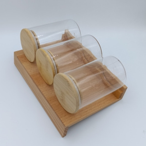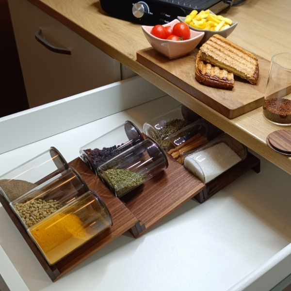 Kayın ağacının doğal dokuları ve estetik görünümü sayesinde, kullandığınız baharatlar yemeklerinizin lezzetini arttıracaktır. Cam baharat kavanozları baharatlarınızın uzun ömürlü ve sağlıklı kalmalarını sağlar. Cam kavanozların kapakları kayın ağacından yapılmıştır. Kavanozlar modülün fiyatına dahildir.