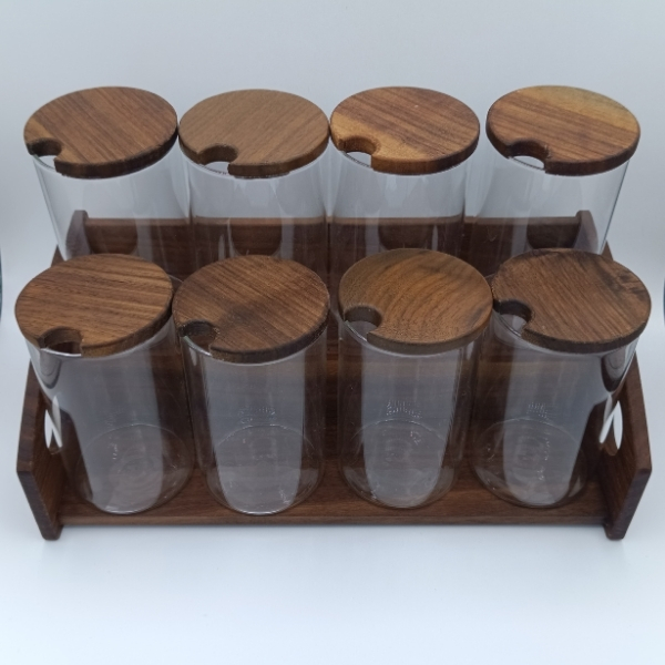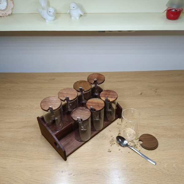Yeni tezgah üstü baharatlık modelinde, ceviz ağacının eşsiz desenleri kaliteyi en üst seviyede yansıtıyor. Sürekli kullandığınız baharatlar cam kavanoz sayesinde her zaman taze ve elinizin altında olsun. Bu model, 8 kavanoz kapasiteli versiyondur. Bu baharatlığın tasarımına ve ölçüsüne uygun kavanozlar, 250 ml, 200ml veya 150 ml hacimlidir. Tezgah veya masa üstünde kullanabileceğiniz bu baharat seti en üst kalitede işçilik ve tasarım detaylarına sahiptir. Doğal yağ kullanılan ahşap baharatlık, fonksiyonel ve keyifli bir kullanım vadediyor.